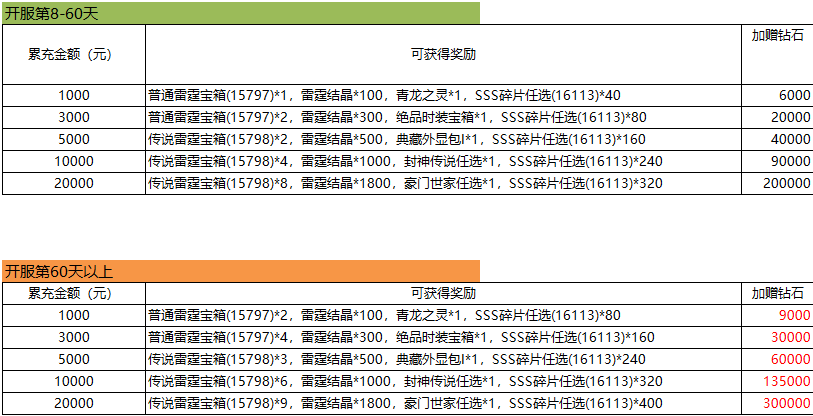 1101-1231单日累充活动【活动时间】11月1日—12月31日【活动范围】全服【活动规则】高档位可以领取低档位奖励【领取方式】达到条件后需向客服申请,申请后