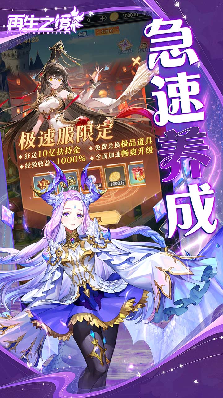 充值比例1元:1000游戏货币 ★【上线狂欢】:上线就送1亿扶持金、VIP25、海量钻石 ★【红包有礼】:免费送万元红包真充卡! ★【扶持商城】:升级闯关送海量扶持金,顶级道具免费兑换! ★【签到福利】:登录送顶级成长礼包、等级礼包! ★【极速养成】:百倍升级速度,助你养成进阶快人一步! ★后缀说明:极速养成,助你快人一步!