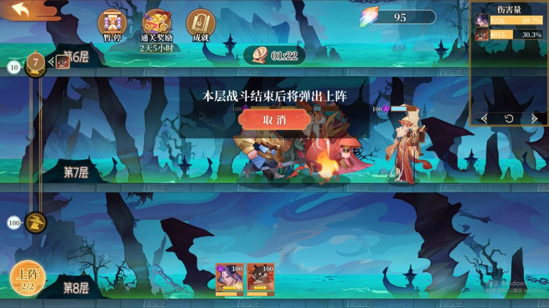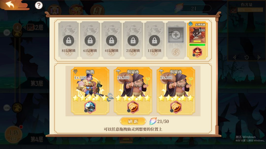 打到一定的层数就会解锁一个新的位置,这时候可以抽卡完善自己的阵容。注意这里选将只能3选1,而且不能上阵相同的仙灵,如果同时刷出来2个好将就要斟酌选哪个了。