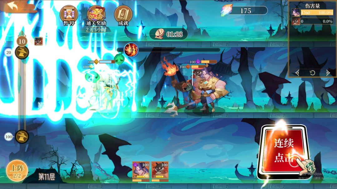 打BOOS关的时候右下角的连续点击点的越快,仙灵的回怒速度越快,释放大招就越快,所以展现你手速的时候到了,点点点点~哒哒哒哒哒~