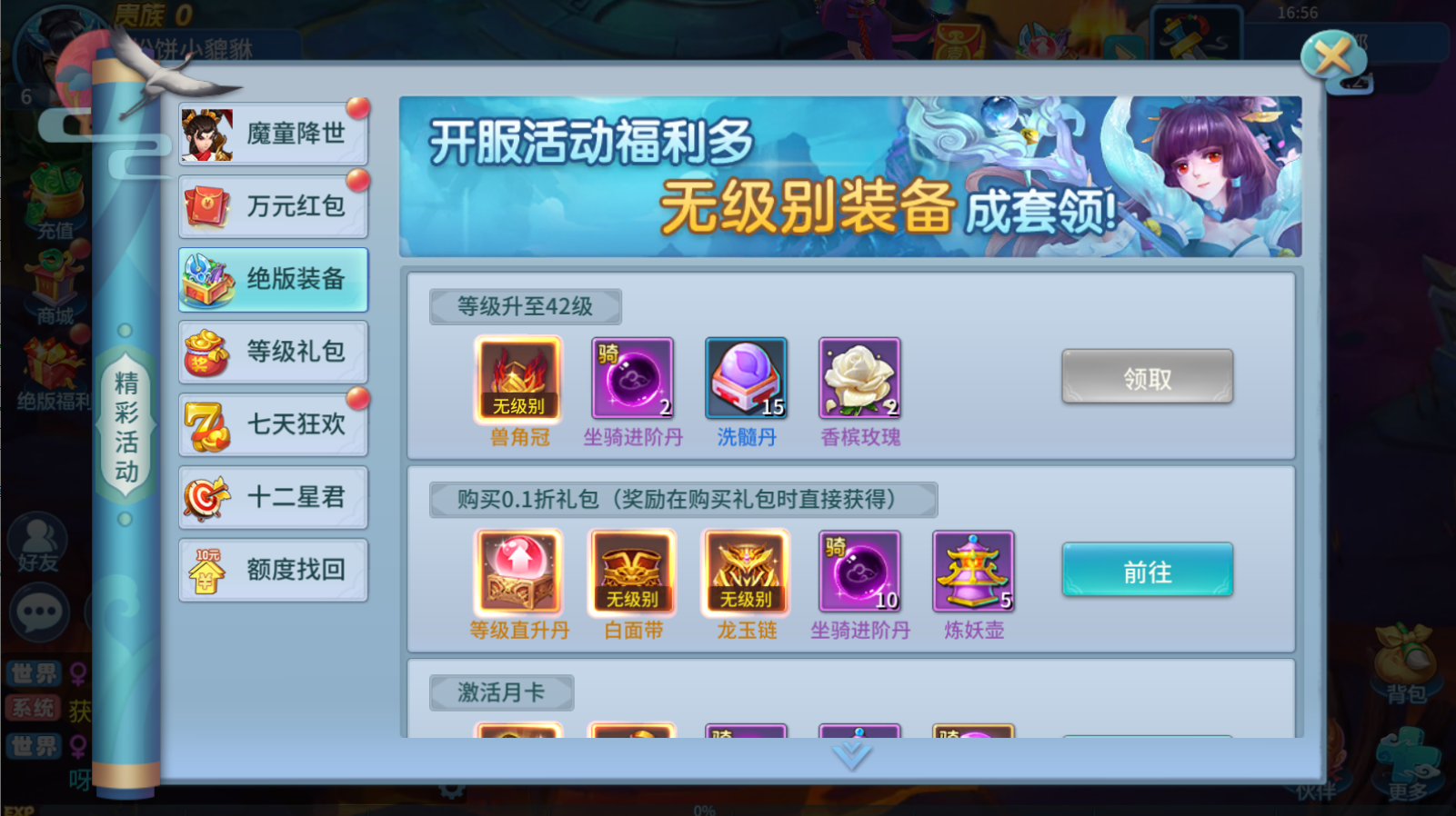 等级福利30级开启礼包兑换150级领取328充值卡200级领取648充值卡300级领取648充值卡400级领取1000充值卡4个等级4个激活码战力福利1000万