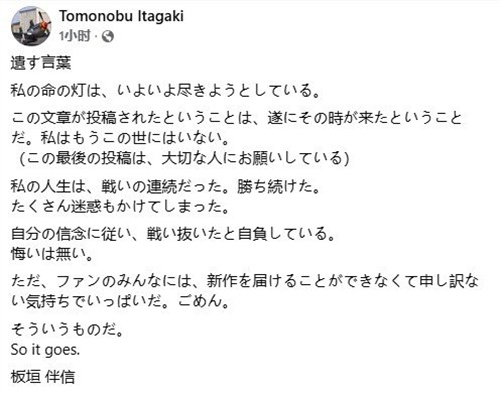 在声明开头,板垣伴信写道:“我的生命之光终于要熄灭了。这篇文章的发表意味着这个时刻终于到来临。(我已拜托一位亲近的人,在我生命走到尽头时发布此文。)”