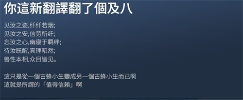 《空洞骑士:丝之歌》发售版本的翻译因其白不白、文不文的翻译风格与添油加醋毁原文的翻译态度被玩家社区诟病,尤其在剧情解析与猎人图鉴方面极为严重。而本次4号补丁的翻译据社区玩家们的反馈,似乎更加不堪。