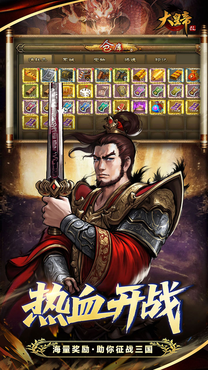 《大皇帝》一款为策略游戏用户量身定制的三国SLG。128座城池,组建自己的势力,亲身参与东汉末年争夺天下霸权的三国征途!玩家亲临乱世汉末,击杀叛贼,临危受命,一举称帝,就此展开一条别样的三国帝王之路。在《大皇帝OL》中,您可以不断地开疆扩土,收复更多的领地,每一座城池都能为您之后提供大量收益,英雄,银两,宝物通通在手!问鼎江山还不够,成为最强帝王才是正道。王者之巅,争夺积分名次,从草根组攀登至尊组;诸侯争霸,经历数轮淘汰,登顶全服帝王宝座。成为无数豪杰仰视的真正大皇帝!