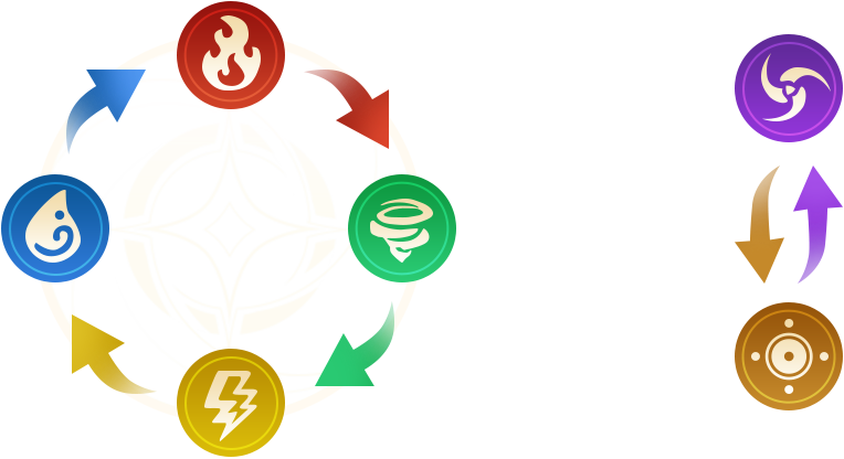 共有六种属性,其属性分别为:水、火、风、雷和天道、混沌六种,水、火、风、雷四种属性形成循环克制,天道、混沌为互相克制。