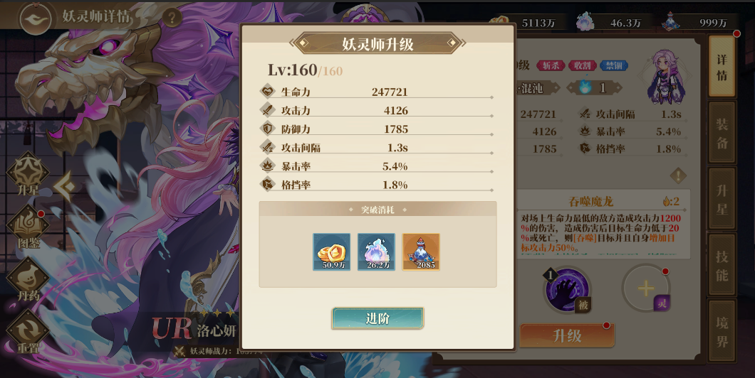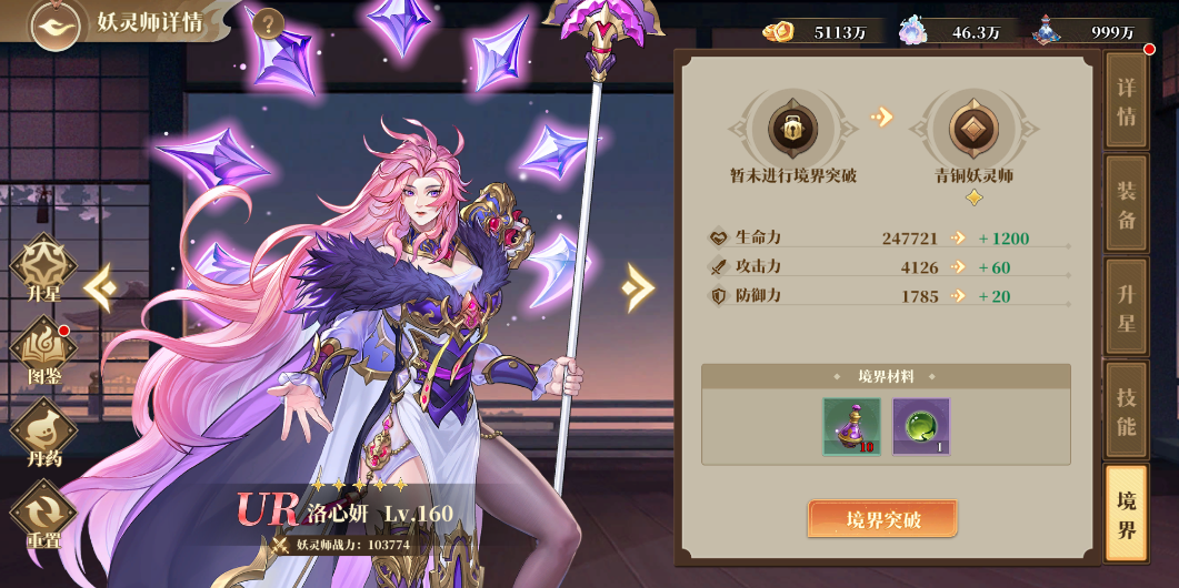 玩家可以通过合理利用资源对重要的角色进行境界升级,当然资源足够的情况下可以随意升级自己想升级的角色。