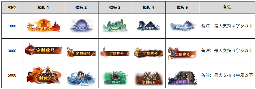 2、提供对应档位的5个模板任选和提供文案内容,不同模板可定制字数不同,同档位可申请重复模版,称号定制内容不能有辱骂敏感词等,若有发现将回收处理。