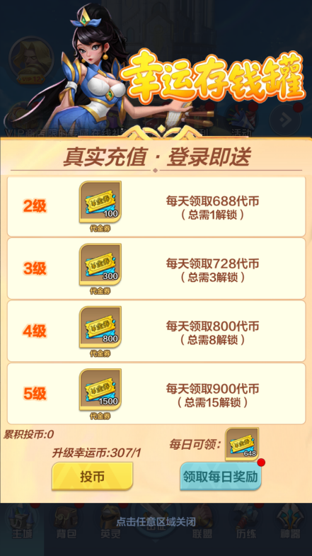 →通过投币升级的方式可以领取到大量的代金券,并且还能提升每日领取到的代金券数量,该版本首推