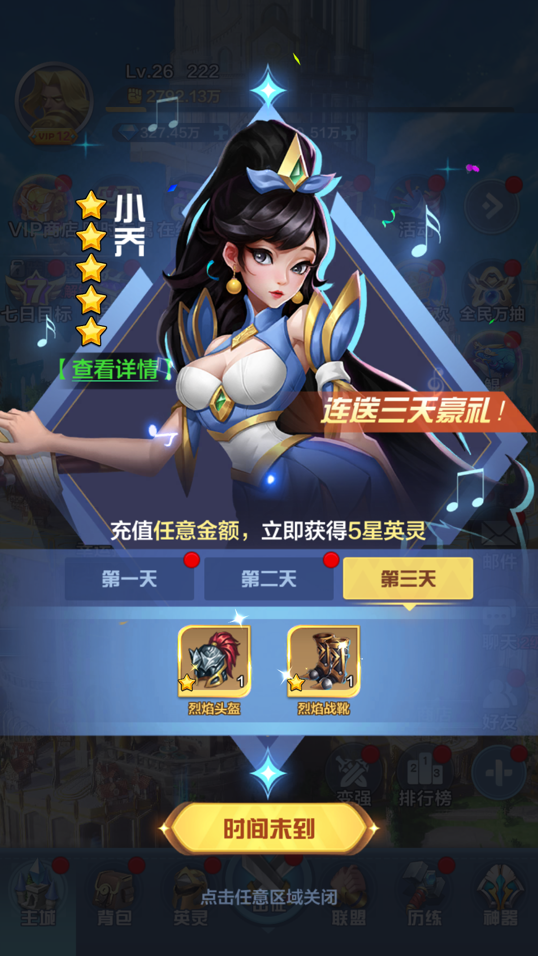 三日首充任意金额即可领取5星英灵小乔与高级装备烈焰套装