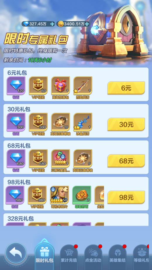 限时购买的终生礼包,内涵大量养成道具,也是性价比极高的礼包